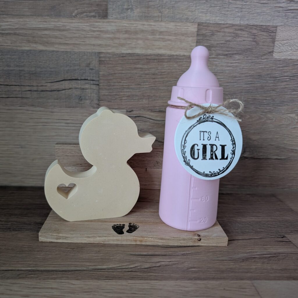 Der Aufsteller ist mit einer Babyflasche in hellblau oder rosa erhältlich.