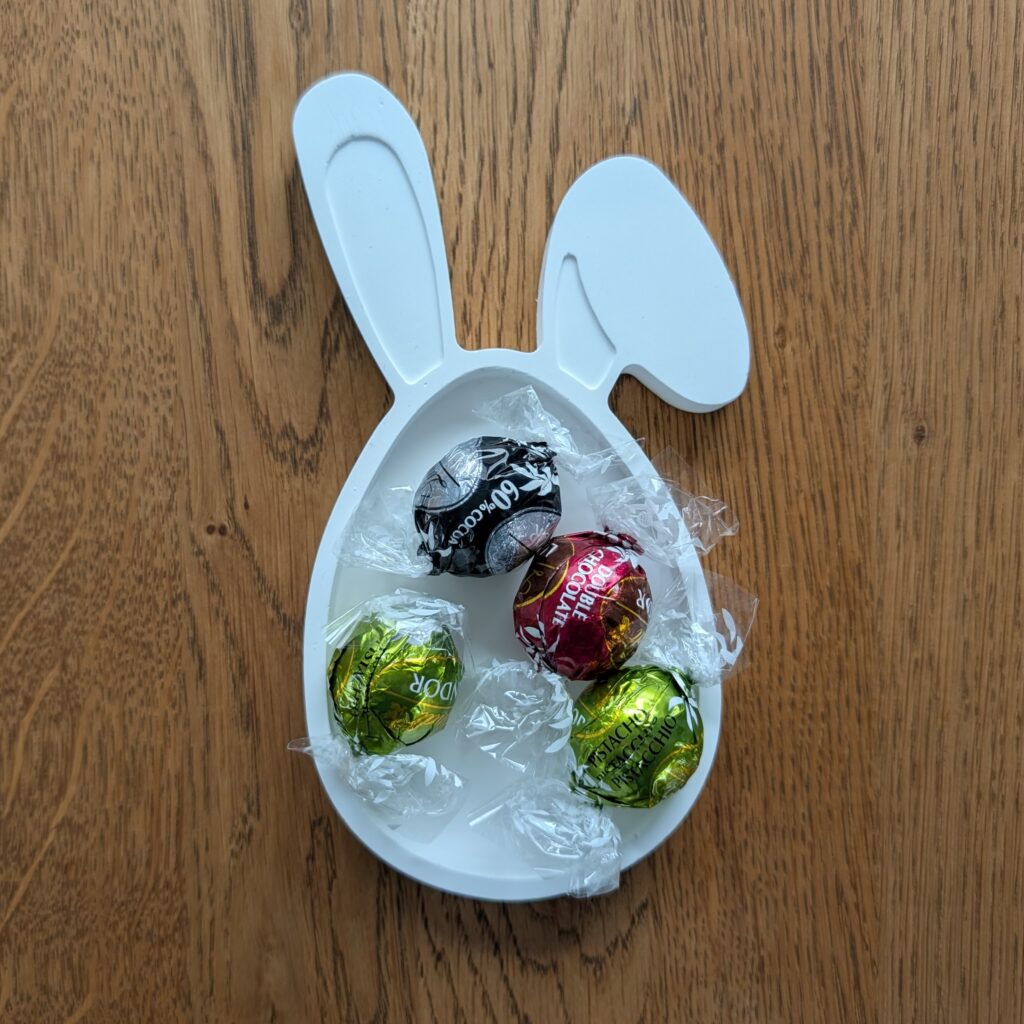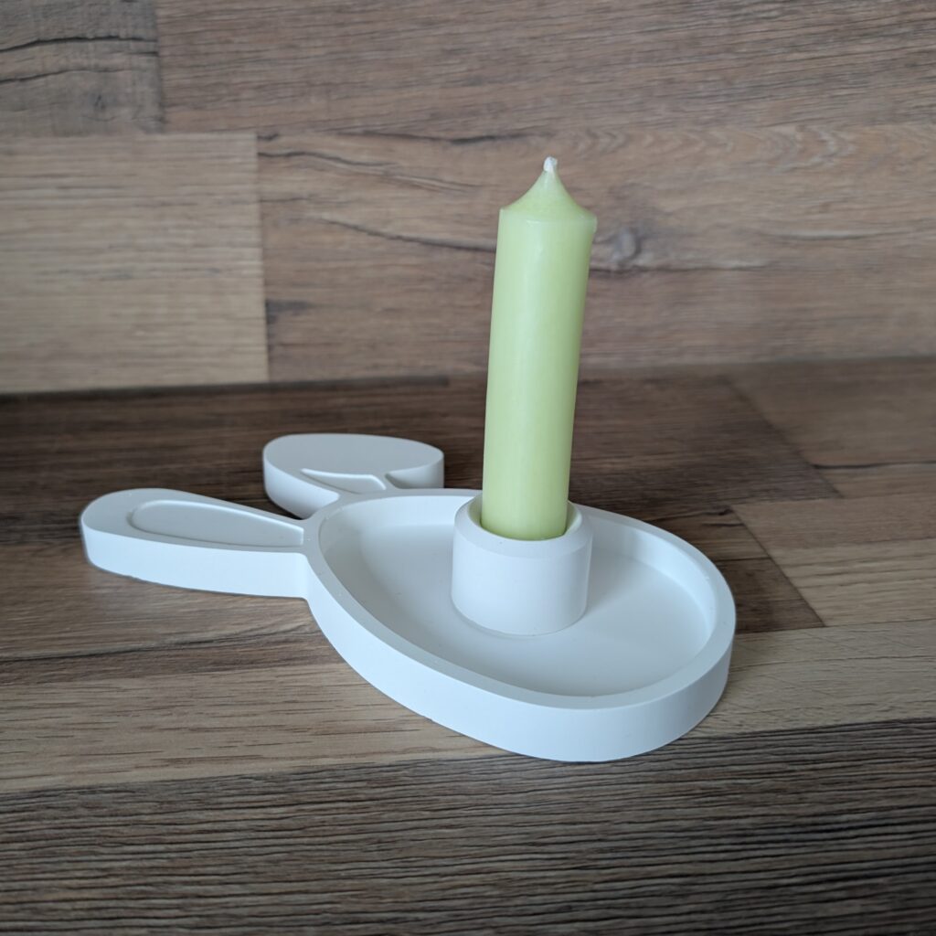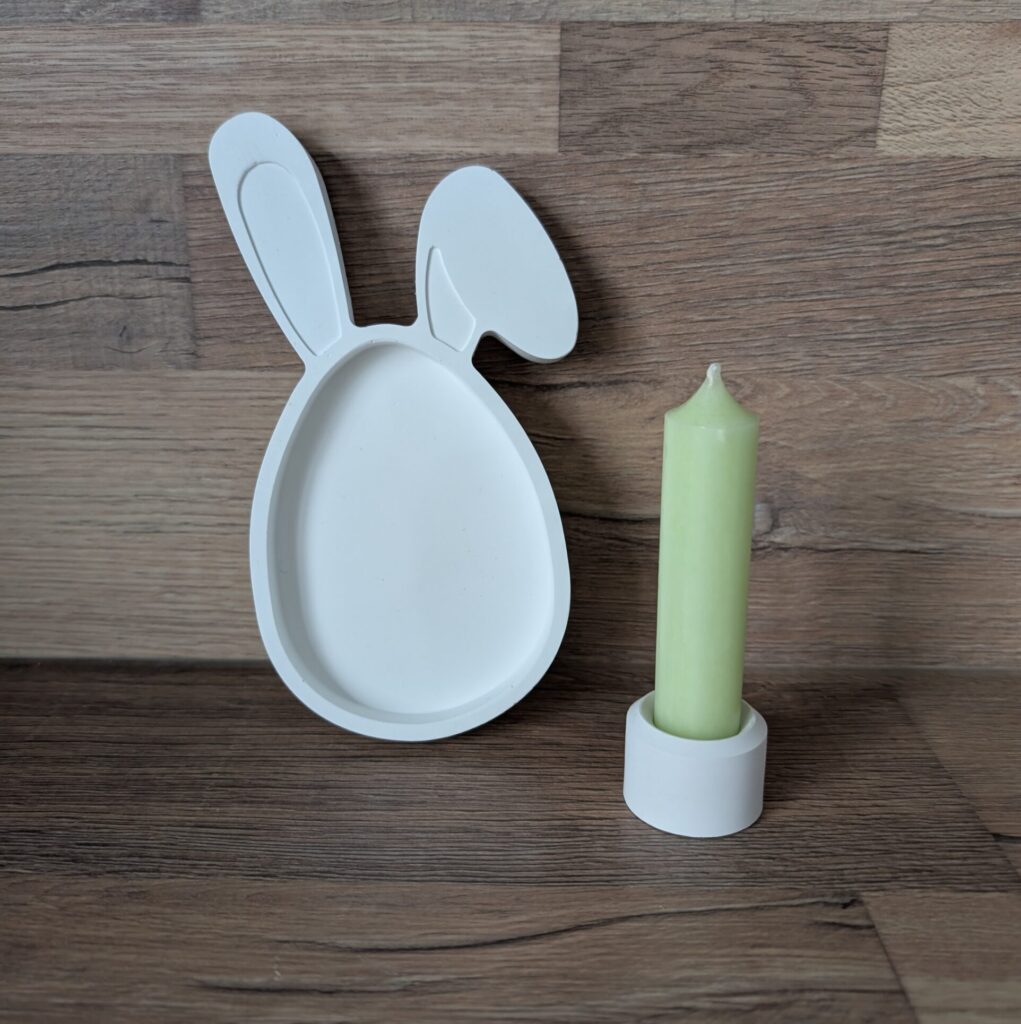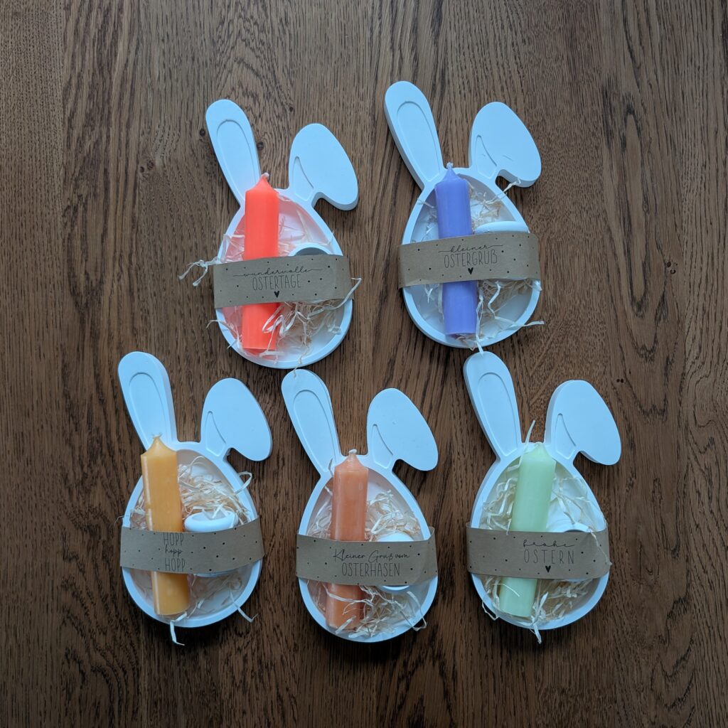 Dekorative kleine Hasenschale aus Gießkeramik im Set mit einem Kerzenhalter und einer bunten kleinen Stabkerze liebevoll verpackt.