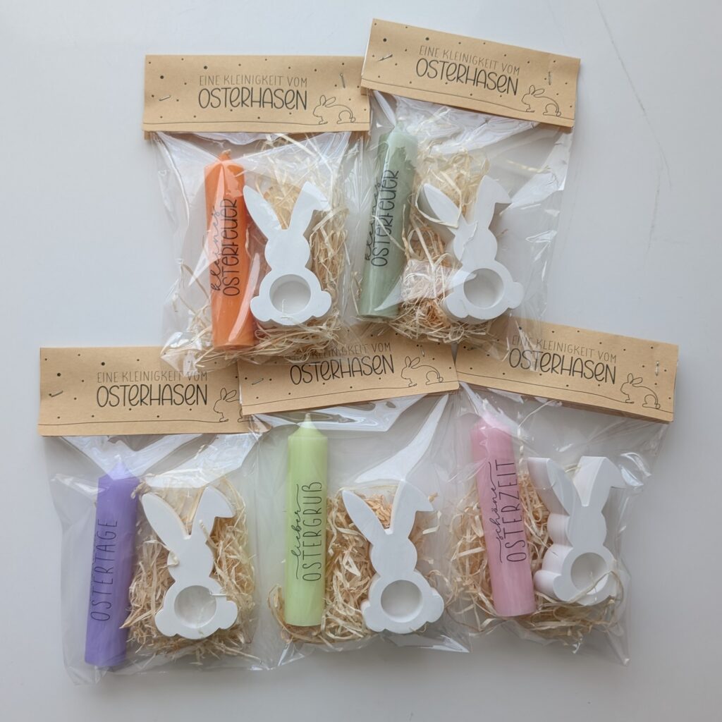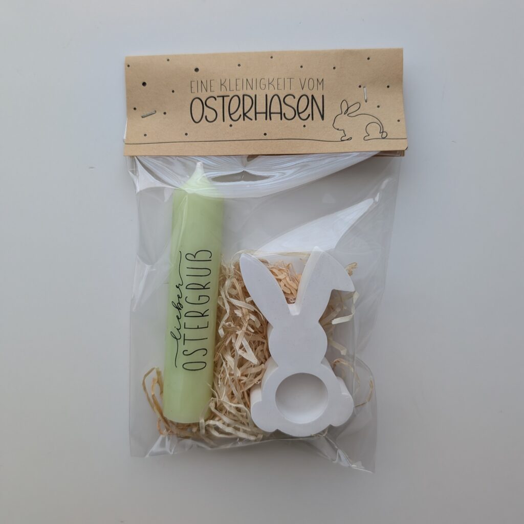 Set mit Hasen Kerzenhalter und einer schönen kleinen Stabkerze liebevoll verpackt.