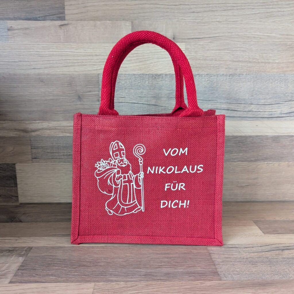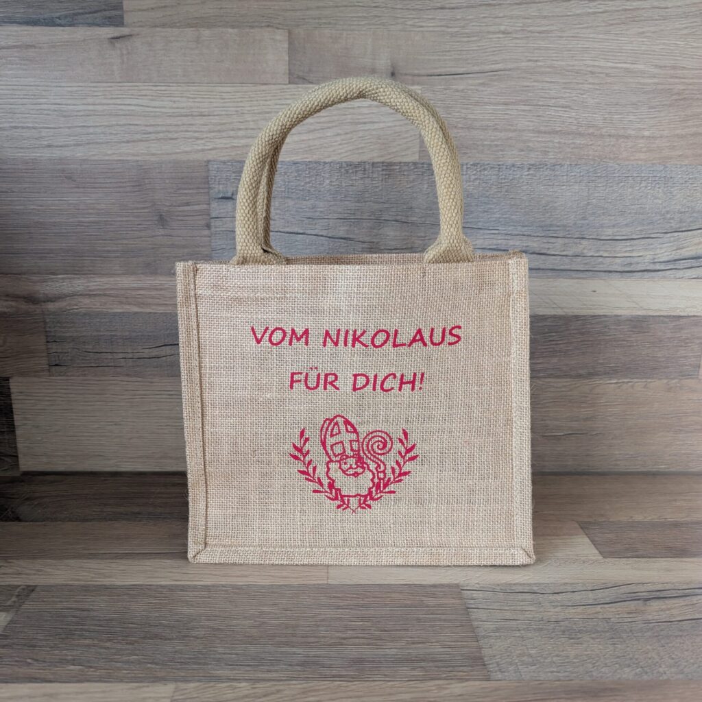 Nikolaustasche aus Jute, erhältlich mit zwei verschiedenen Motiven.