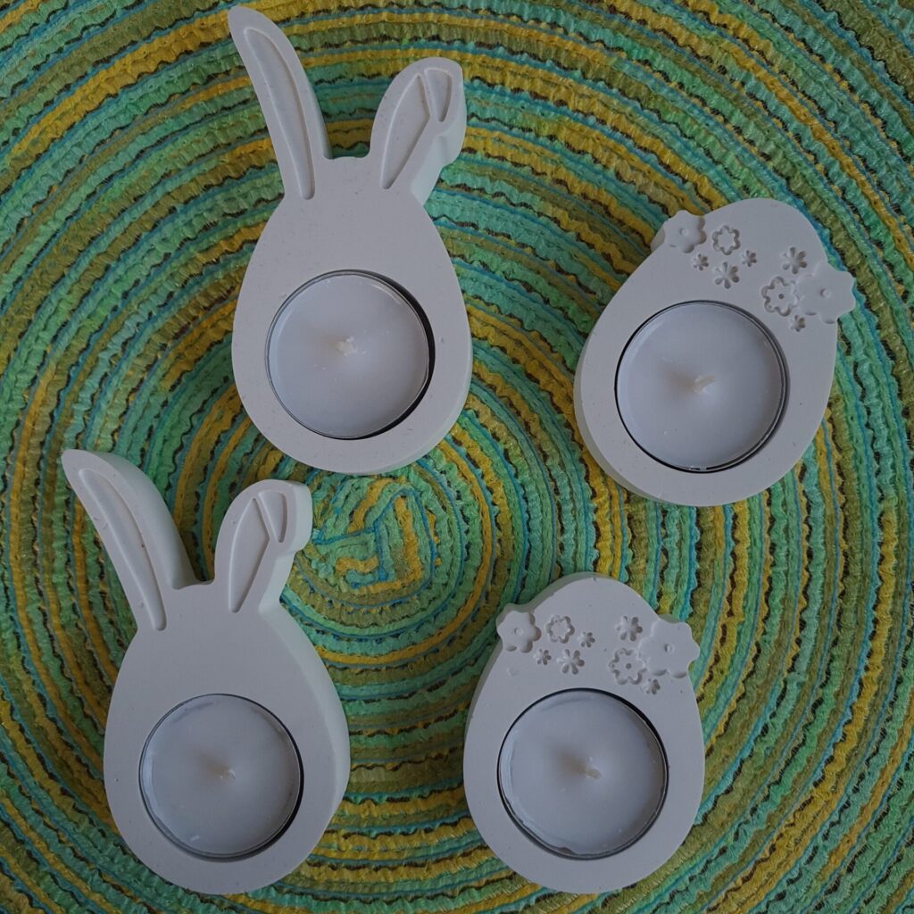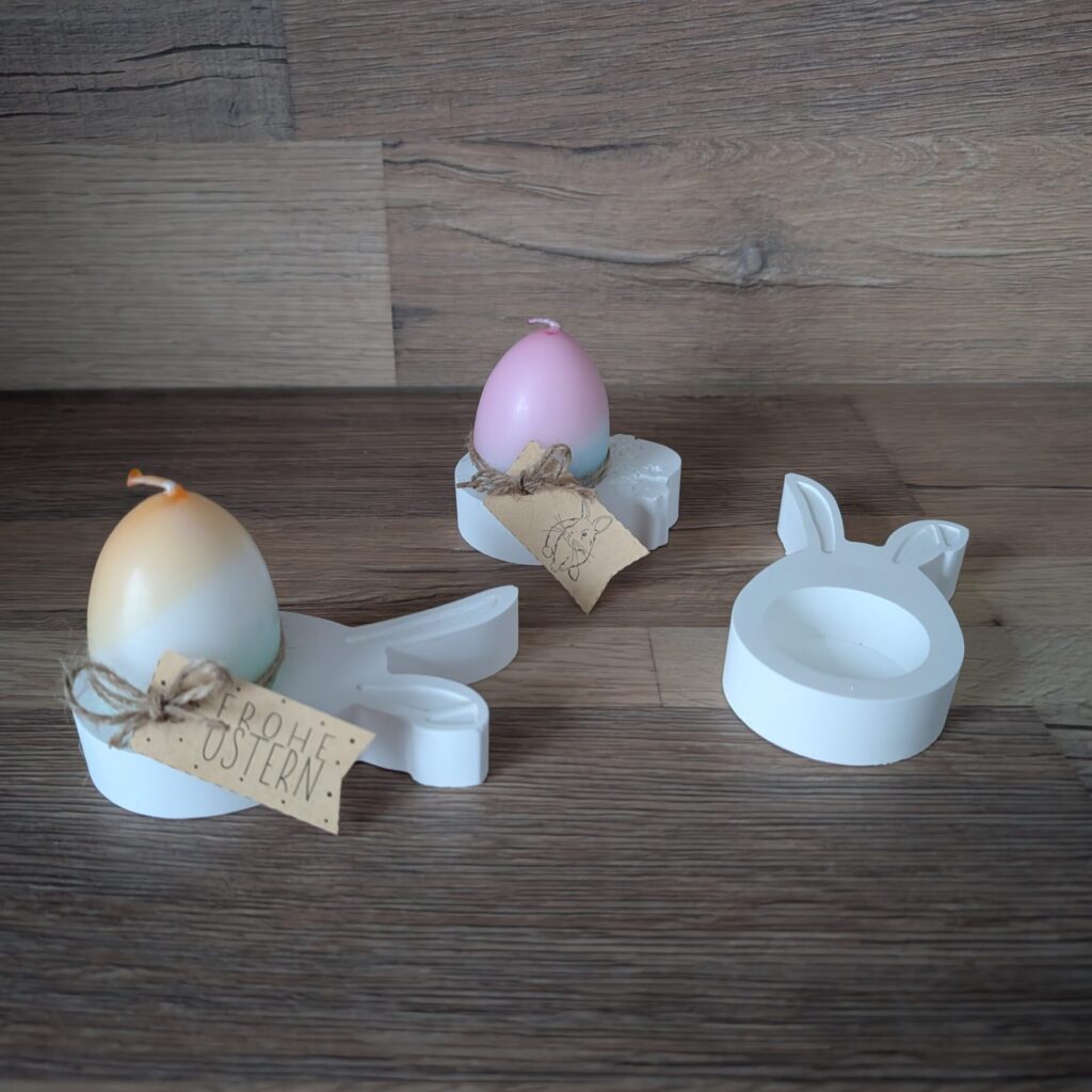 Süße dekorative Eierbecher/ Teelichthalter aus Gießkeramik im Set mit einer DipDye Eikerze. Kerze ist in drei verschiedenen Farben erhältlich.