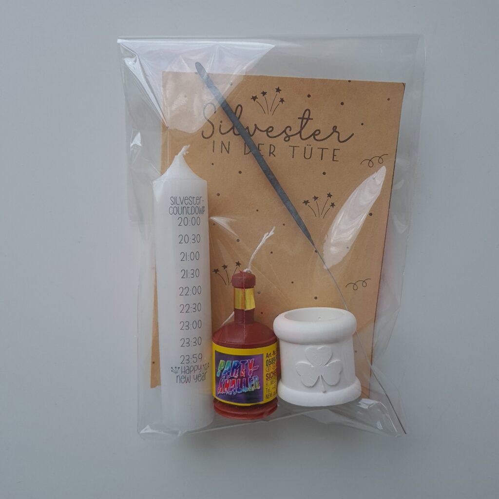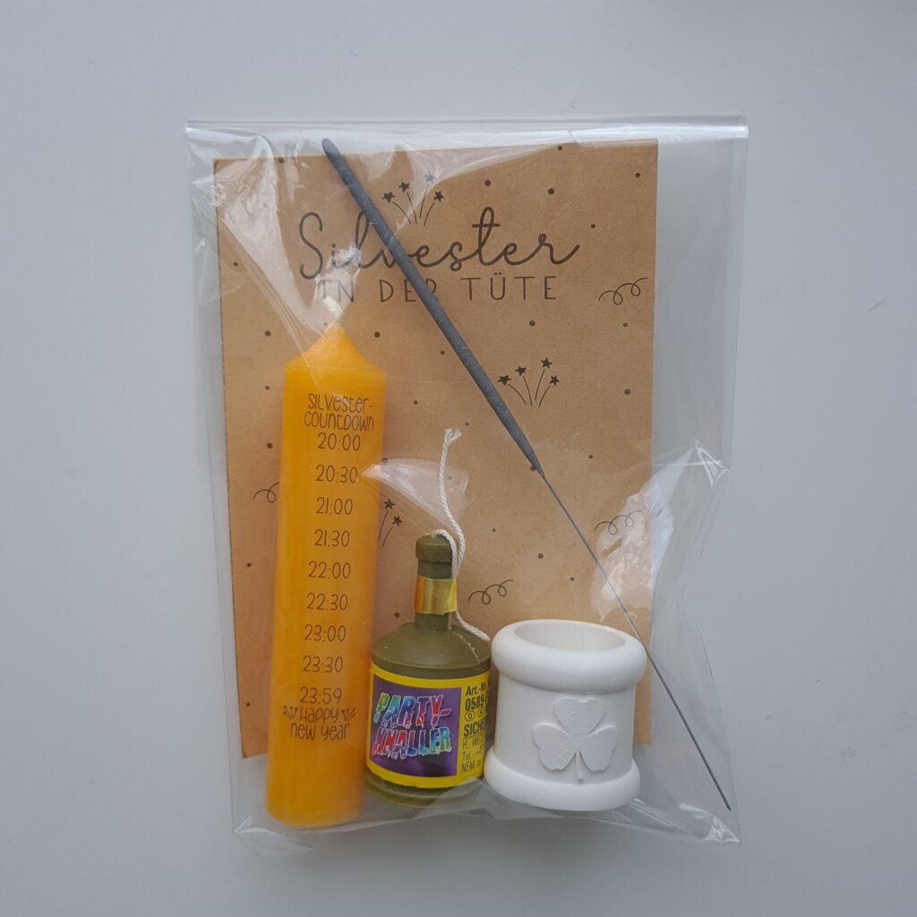 Silvester Set mit kleiner Silvestercountdown Kerze, Kerzenhalter, Tischfeuerwerk und einer Wunderkerze.