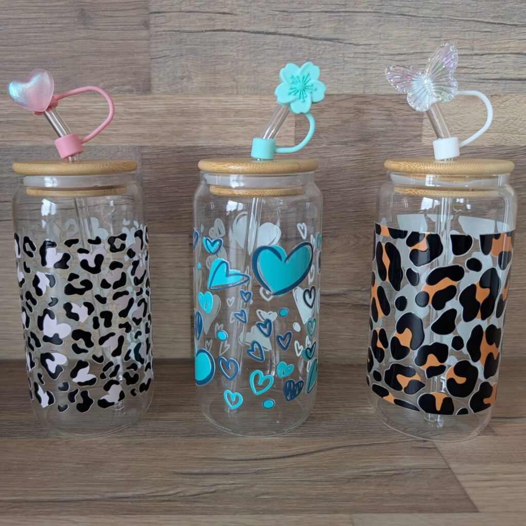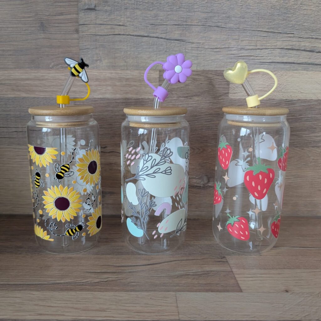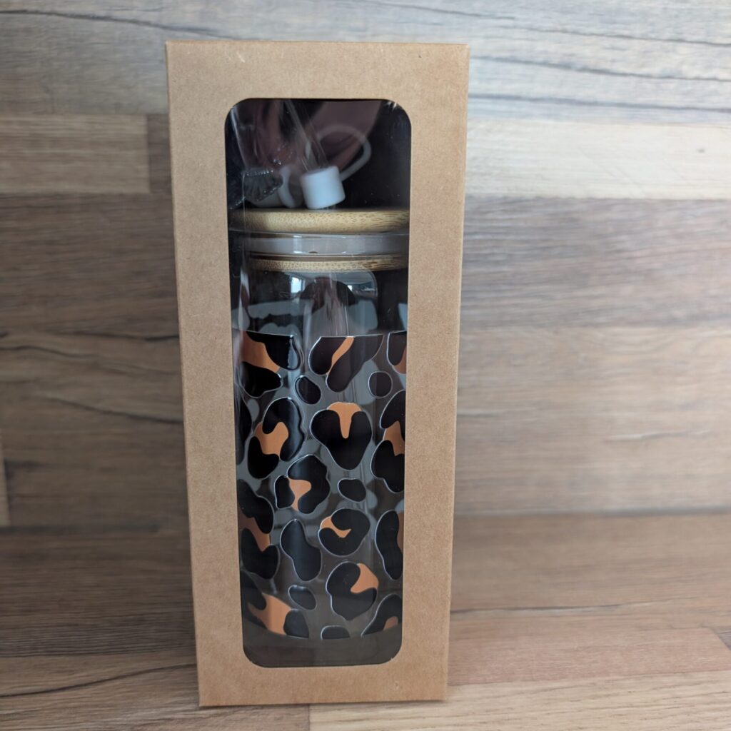 Tolle Trinkgläser aus Glas im Set mit einem Bambusdeckel, einem Glasstrohhalm, einer Strohhalmabdeckung und einer Reinigungsbürste erhältlich. Verpackt in einem Karton.